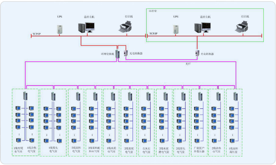 中材萍乡水泥有限公司厂区重点用电回路分别分布于1线原料高压室、1线窑尾电气室、1线窑头电器室、2线原料电器室、2线原料配料电气室、1线水泥电气室、2线窑尾电气室、石灰石电气室、2线水泥磨电气室、2线窑头电气室、厂前区户外变压器、1线余热电气室以及2线余热电气室等共计13个电器室内。