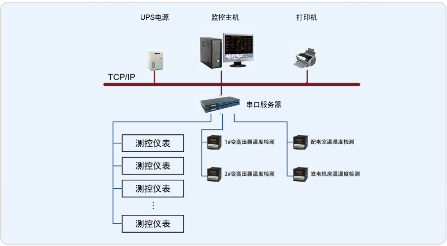 系统主要实现中国建设银行股份有限公司云南分行本部地下B2变电所的0.4kV配电系统进行用电监测与电能管理;监测范围为改造变电所的T1、T2变压器的馈线柜、母联柜、电容补偿柜,变压器的相间温度、配电室和发电机房的温湿度,馈线柜和母联柜侧仪表进行远程实时监控和电能管理。该系统总计有29只仪表,分4条总线,都是直接通过屏蔽双绞线走管道拉至值班室后连接到串口服务器上,实现总线上仪表与监控主机的数据连通。